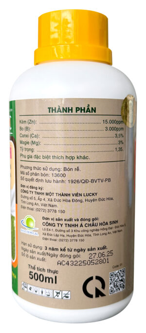 Kẽm (Zn): 15.000ppm Bo (B): 3.000ppm Canxi (Ca): 3,5% Magie (Mg): 3% Tỷ trọng: 1,35. Phụ gia đặc biệt thích hợp khác.