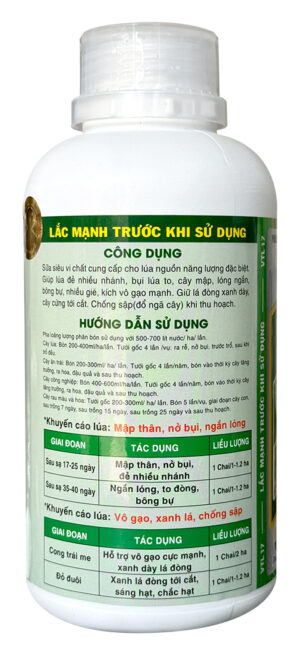 Sữa siêu vi chất cung cấp cho lúa nguồn năng lượng đặc biệt. Giúp lúa đẻ nhiều nhánh, bụi lúa to, cây mập, lóng ngắn, bông bự, nhiều gié, kích vô gạo mạnh. Giữ lá đòng xanh dày, cây cứng tới cắt. Chống sập(đổ ngã cây) khi thu hoạch.