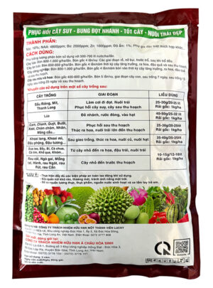 | Sầu Riêng, Mít, Thanh Long | Làm cơi đi đọt. Nuôi trái Phục hồi cây suy, cây sau thu hoạch | 25-30g/20-25 lít Rải gốc: 1kg/ha |