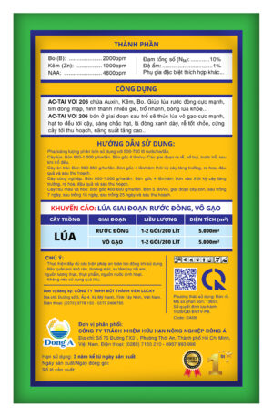 Công dụng: AC-TAI VOI 206 chứa Auxin, Kẽm, Bo. Giúp lúa rước đòng cực mạnh, tim đòng mập, hình thành nhiều gié, trổ nhanh, bông lúa khỏe… AC-TAI VOI 206 bón ở giai đoạn sau trổ sẽ thúc lúa vô gạo cực mạnh, hạt to đều tới cậy, sáng chắc hạt, lá đòng xanh dày, rễ tốt khỏe, cứng cây tới thu hoạch, năng suất tăng cao..